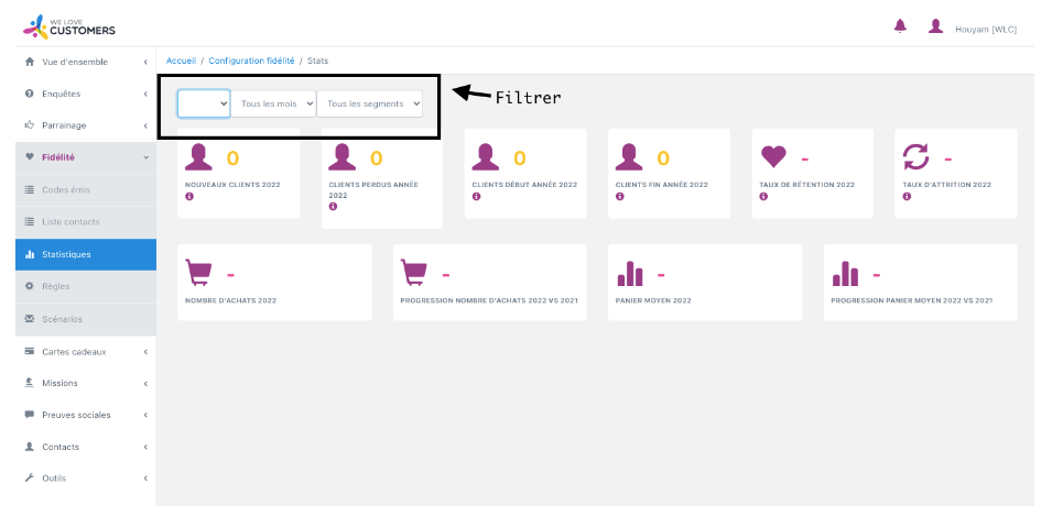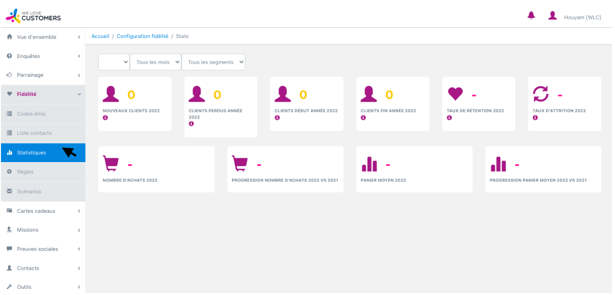 Vous avez la possibilité de filtrer ces statistiques par date, ce qui vous permet d’obtenir des données précises sur des périodes spécifiques. Cela peut être particulièrement utile pour analyser l’efficacité de votre programme fidélisation à différents moments de l’année.